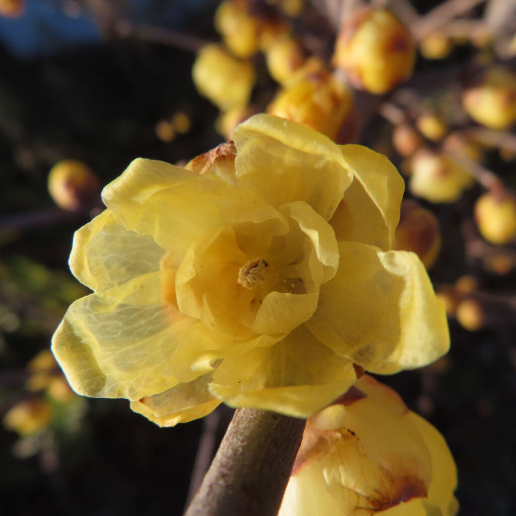 つぼみは「蝋梅花」として生薬に用いられ、鎮咳・解熱・やけどなどの薬効があるとされます。花や根、茎も薬用に利用されることがあります。