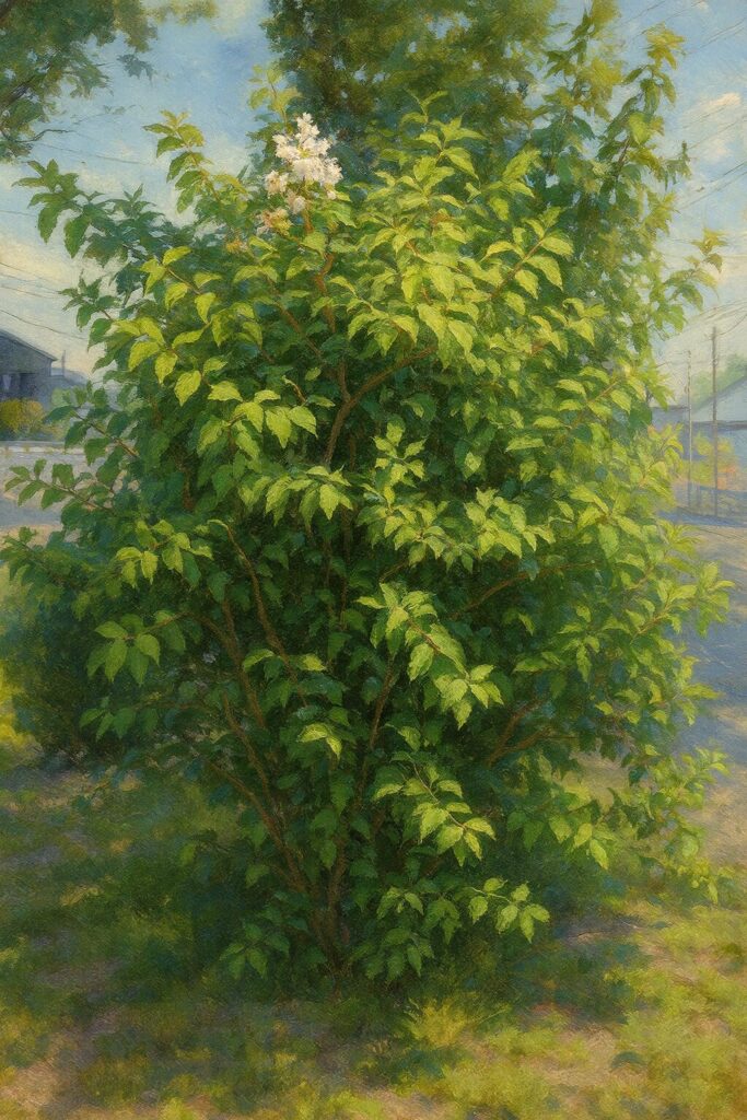 - 花:5〜7月に白く小さな花を多数咲かせ、枝先に円錐花序をつける