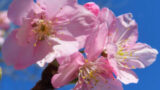 「花の後ろに多くの枝が写らない」ような被写体を選びましょう。青空を背景としてスッキリ見せたいので枝が多いと難しくなるためです。梅の木は枝が多く伸びているため、枝先に咲いている花が好都合だと思います。その花を下から見たときに、枝だけでなく電線や建物が写り込まないことをチェックしてみてください。