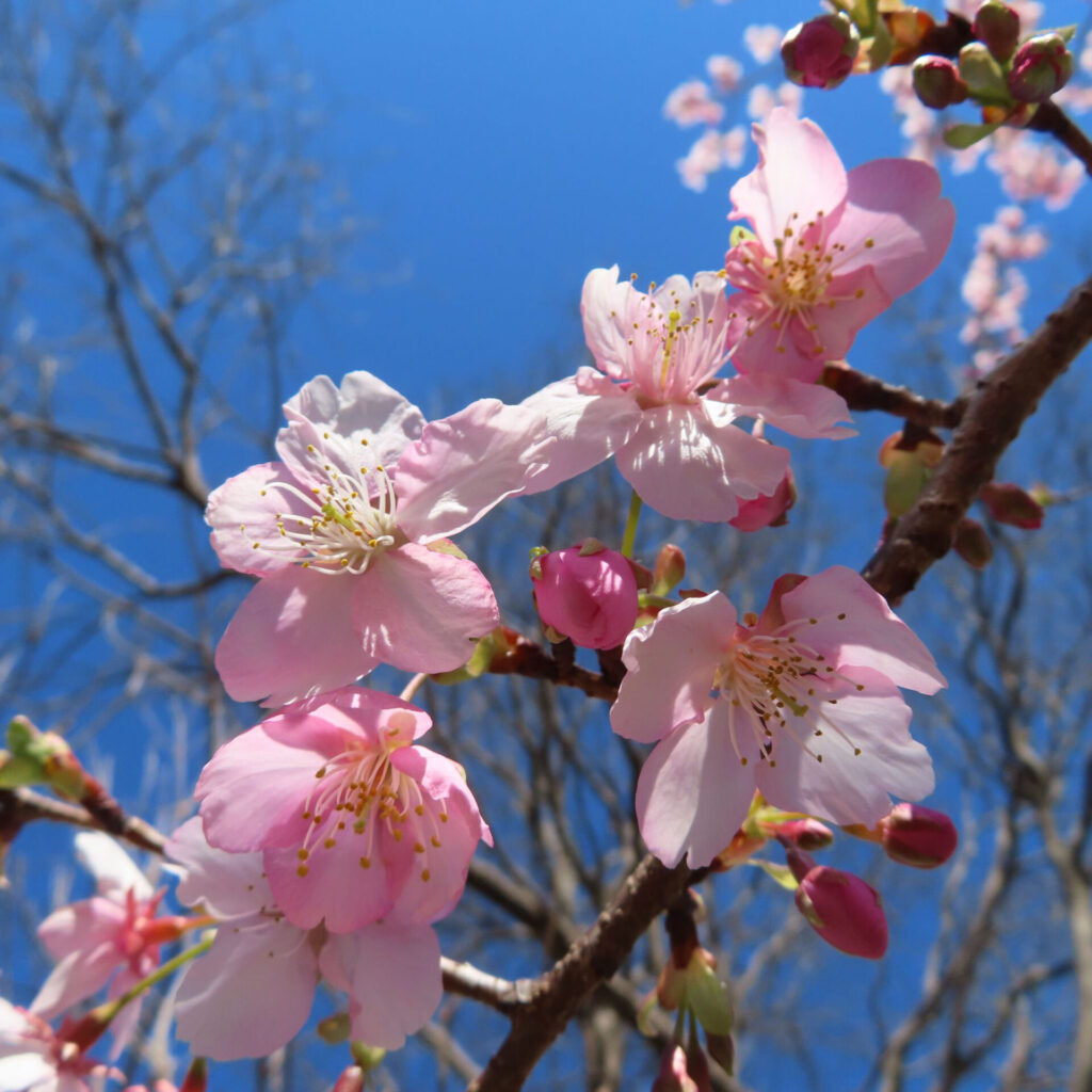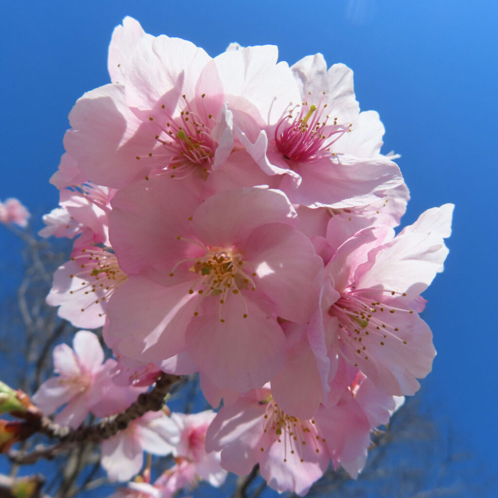 カワヅザクラ(河津桜、Cerasus × kanzakura ‘Kawazu-zakura’)は、オオシマザクラとカンヒザクラの自然交雑によって誕生した、日本原産の栽培品種です。早咲きで大輪、紫紅色の花が特徴で、2月頃に見ごろを迎えることから、春の訪れを告げる桜として親しまれています。